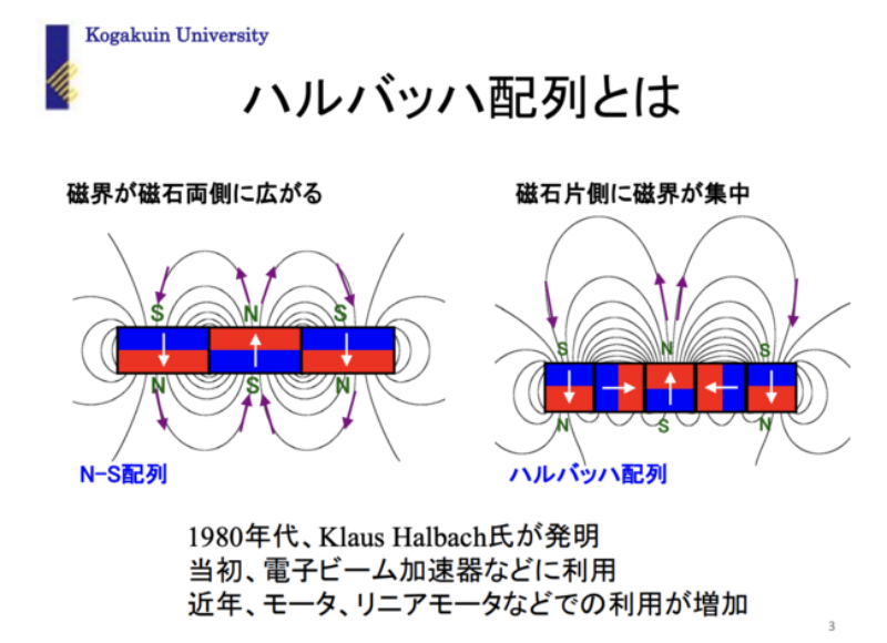 In a magnet array (called a Halbach array) in which the magnetic poles are rotated at a predetermined angle and arranged in a row, the magnetic flux on the back side of the array is applied to the front side, and a smooth and strong magnetic field is generated on the front side. By combining this magnetic field with a coreless coil, the output voltage of the generator does not drop even if a large current is taken out, a generator with less vibration and noise can be realized, and a weight reduction of about 30% is realized. This technology is based on the patented invention of Professor Morishita of Kogakuin University, and the license of the Halbach generator is owned by the ADJ development partner.