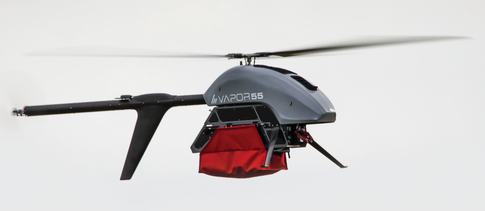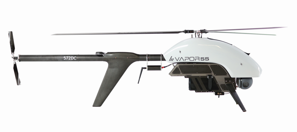 VAPOR 55 (GTOW 55 lbs., 24.9 kg) – The versatile, powerful and easily configurable VAPOR 55 is designed to satisfy complex operational requirements. Heavy lift capable with up to 10 lbs. (4.5 kg) of usable payload weight (belly, side or slung), VAPOR 55 is single or multiple payload capable with access to a variety of integrated sensors, Drop/Delivery mechanism and third-party payload options.