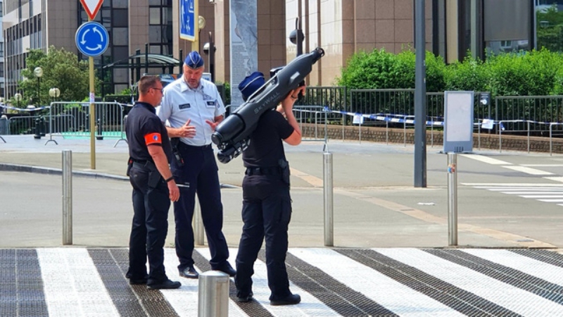 Pictures of the two systems were published on social networks. The fact that the defense of leaders today includes anti-drone weapons is a reminder that the small unmanned aircraft could even be used for assassination attempts. Belgian federal policemen wielded a weapon that launches munitions toward drones as well as a device that jams and blocks transmissions using radio frequencies in order to cut the communications between hostile drones and their operators.