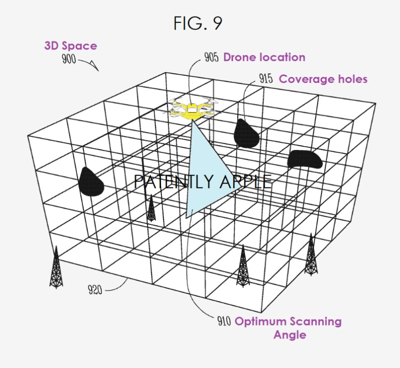 In March Patently Apple posted an IP report titled "Apple has Won a Patent relating to Drones, Unmanned Aerial Vehicles," and more importantly relating to drones connected to cellular networks. Below is Apple's patent FIG. 9 from the March patent that illustrates a three-dimensional space for which an optimum scanning angle has been determined for a particular drone location.