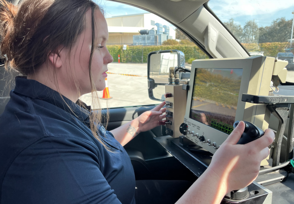 Slinger uses sophisticated technology to achieve a blunt result. In Canberra, EOS test engineer Charlotte Capper used a joystick to follow a drone on the system's targeting screen.