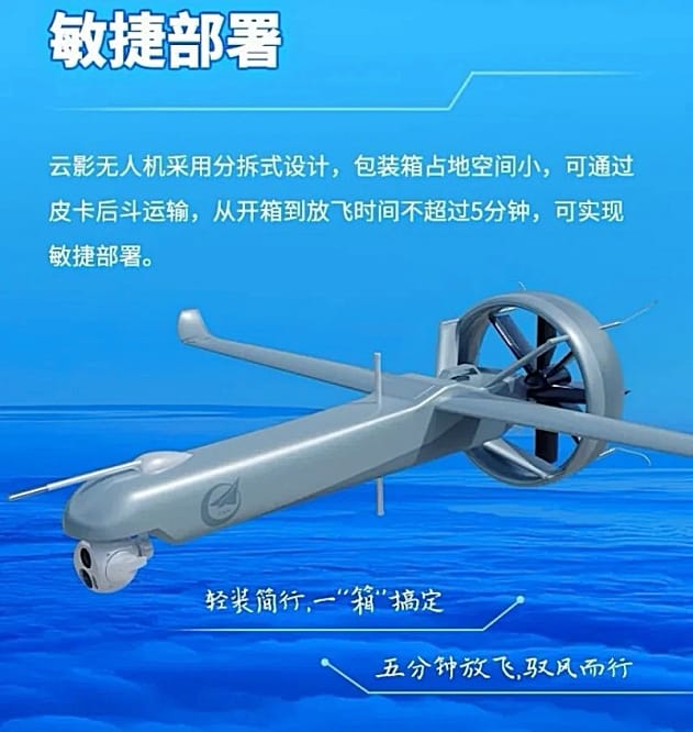 The Yunying drone is designed for “convenient vertical takeoff and landing,” enabled by a specialized airframe layout and flight-control algorithms intended to improve adaptability across different environments. The manufacturer stated that the aircraft requires only a 3-by-3-meter area for launch and recovery, allowing operations from limited terrain or moving platforms.
