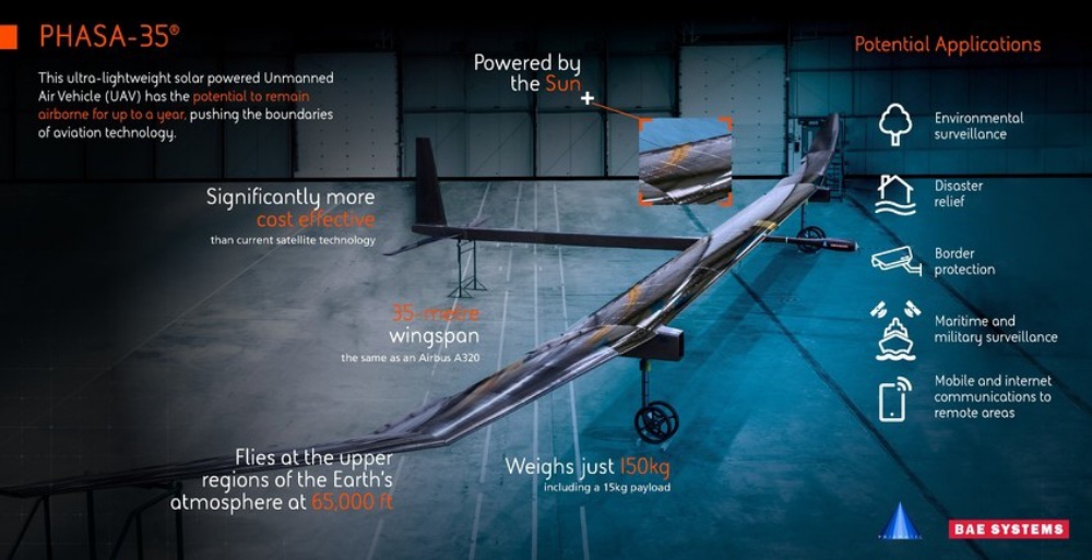 Due to being made from ultra-thin carbon fibre composite material, PHASA-35 has a lightweight build and high aerodynamic efficiency, which allows it to fly at high altitudes for extended periods of time. The aircraft has also been designed to be easily manufactured. The prototype PHASA-35 has a 35-metre wingspan and weighs just 150kg, including a 15kg payload.PHASA-35, when connected to other technologies and assets, will provide both military and commercial customers with capabilities that are not currently available from existing air and space platforms. The UAV has the potential to be used in the delivery of 5G networks, as well as provide other services, such as persistent surveillance, disaster relief and border protection, at a fraction of the cost of satellites.Source: Press Release