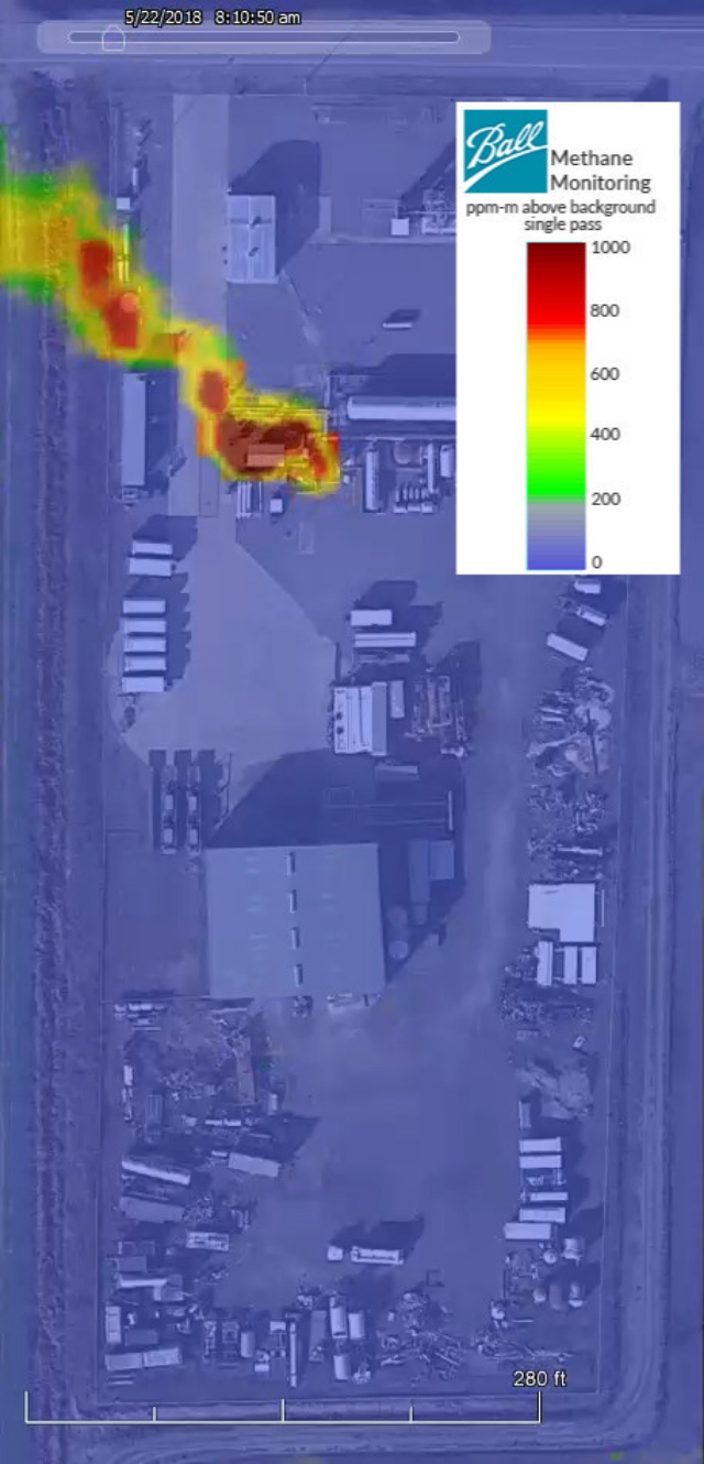 During the challenge, the Ball Methane Monitor was flown on a twin-engine aircraft flying at 125 miles per hour at an altitude of up to 3,500 feet. This rapid and long-range flight enables an efficient, accurate and cost-effective survey of widely dispersed facilities without the speed and range limitations of today's unmanned aerial vehicles or ground-based mobile systems. Initial results were returned to the Stanford and EDF test conductors within 6 hours after flight, with a full report delivered within 24 hours.