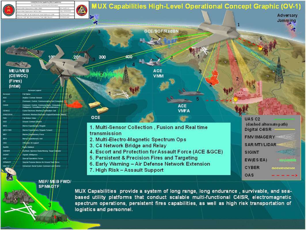 What the Marines refer to as “Offensive Air Support” is relatively low on their priority list for the MUX drone, ranked fifth out of seven total potential missions for the system, according to documents the service publicly released in June 2018. An airborne early warning platform is the Corps’ most pressing demand as it is a capability the Marines presently rely on other services to provide. You can read about the MUX’s possible mission profiles in greater detail in a past War Zone feature on this system.
