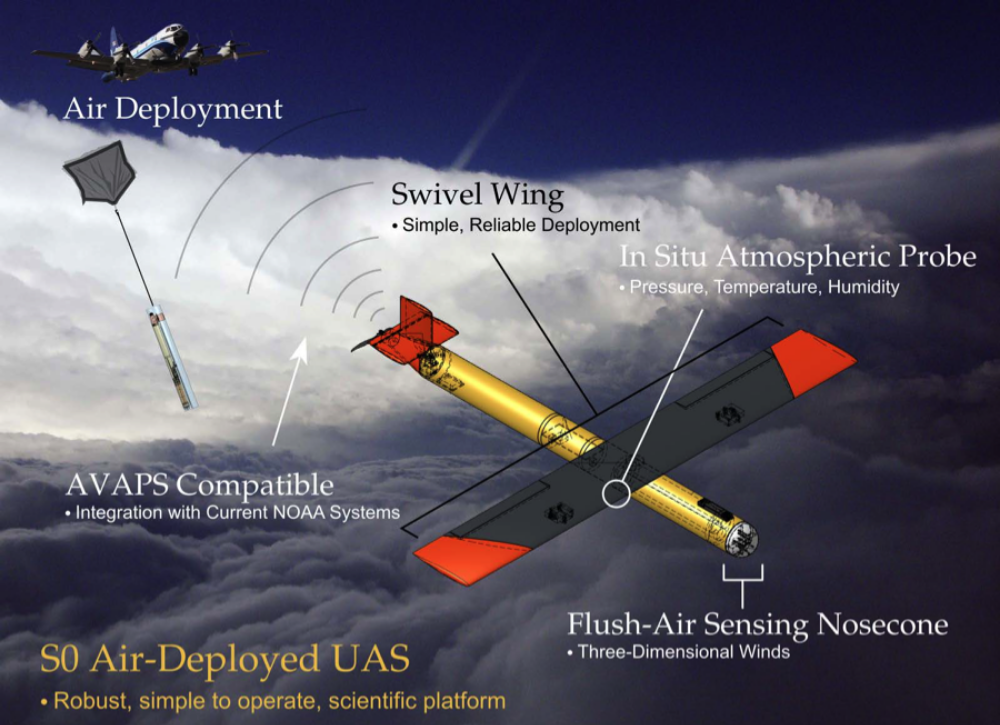 BST is proposing a vehicle, called the S0 Air-Deployed UAS, that can be tube-launched from an aircraft, such as NOAA’s Lockheed P3 Orion. The design of the S0 UAS system is intended to mimic the operations of radio dropsondes already used by NOAA in these environments, reducing the workload of the operators and keeping with the current overall CONOPS. BST’s goal is to provide a cost-effective, air-launched UAS designed to augment pressure, temperature, humidity and sea surface temperature measurements, with 3D wind data. The S0 UAS is designed to provide intelligent and autonomous extended sampling (1+ hour of targeted observations) where the aircraft can make its own navigation decisions based on the atmospheric sensor data.
