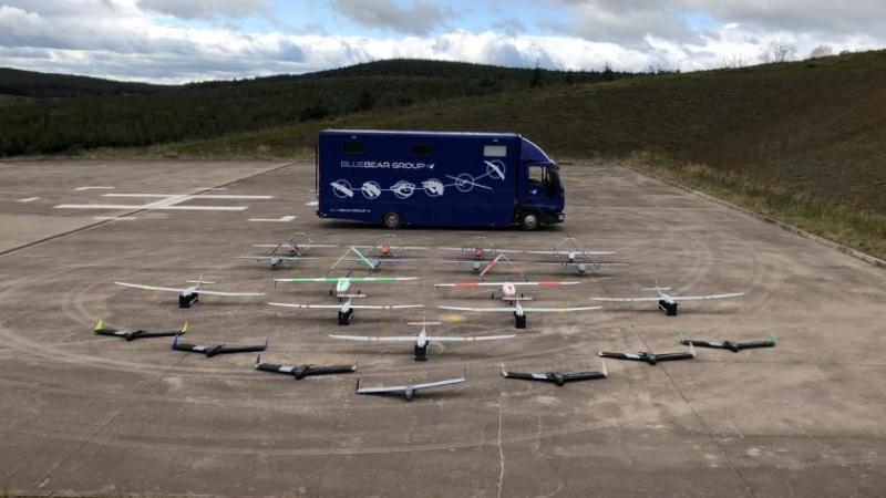 The latest heterogeneous swarm was made up of five different types and sizes of fixed wing Blue Bear drones, including Vertical Take Off and Landing (VTOL) fixed wing Ghost/Modular Ghost UAS, conventional fixed wing Red Kite UAS, conventional fixed wing Cobra UAS and smaller hand launched Flat Pack UAS.