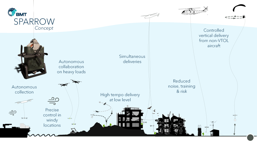 The SPARROW concept was initially developed by a team at BMT for defence applications where drones are being trialled to resupply troops and deliver items such as sterilised medical equipment to dispersed, unpredictable, and potentially hostile locations. Still early in its development, SPARROW was selected by the UK Ministry of Defence for the highly competitive annual flagship innovation event called the ”Army Warfighting Experiment”. The world-first demonstration took place in HM Naval Base Portsmouth, UK, in November 2022 with the associated ”Exploitation Event” in February 2023.