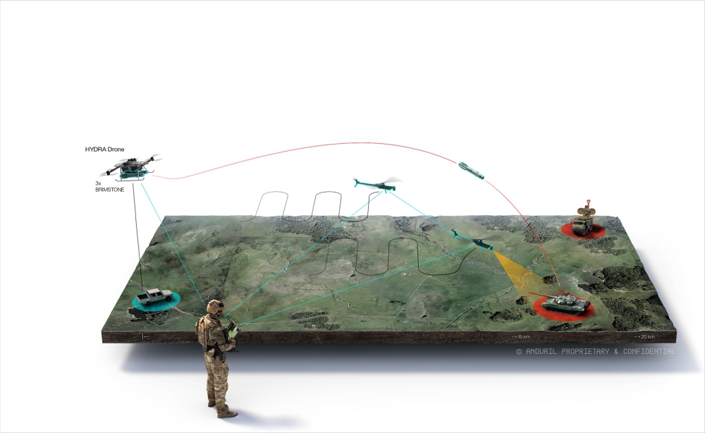 An Anduril Ghost Drone provides real time Artificial Intelligence, surveillance and multi-mission reconnaissance capability. Combined with the versatility of the Hydra drone and the precision of the Brimstone missile, this is a fully automated ‘end to end’ decision support weapon system.