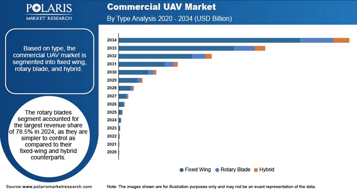 The commercial unmanned aerial vehicle market segmentation, based on type, includes fixed wing, rotary blade, and hybrid. The rotary blades segment accounted for the largest revenue share of 78.5% in 2024. Rotary blades UAVs, which include one to eight rotors to generate the required thrust, are easier to control as compared to their fixed-wing and hybrid counterparts. Also, they can hover and maneuver while maintaining a visual on a specific target for prolonged periods, making them a popular option for inspection tasks. Besides, the sensor stability and vertical takeoff and landing capabilities of rotary blade UAVs make them the apt choice for several professional uses, including photography, filmmaking, surveillance, and monitoring.