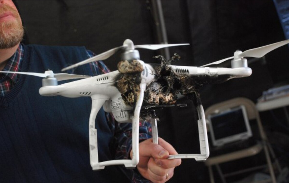 A quadcopter mini-drone downed by an Army laser in a 2016 test