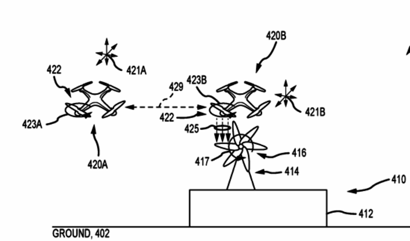 According to the patent’s abstract description, it’s described as “an aerial show system for leveraging downwash and other forces to use an unmanned aerial vehicle (UAV/drone) as a creative element in a show.”