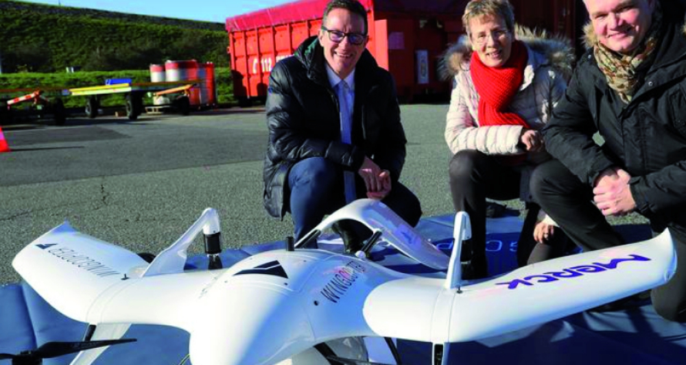 Pigment samples are flown with a special drone from Merck's Gernsheim plant to the laboratory in the headquarters of the science and technology company in Darmstadt, around 25 km away, where they have to be analyzed to ensure quality in the ongoing production process. So far, the transport has been carried out by a small van that travels the route between the plants twice on weekdays. The official first drone flight took place successfully on February 5, 2020.