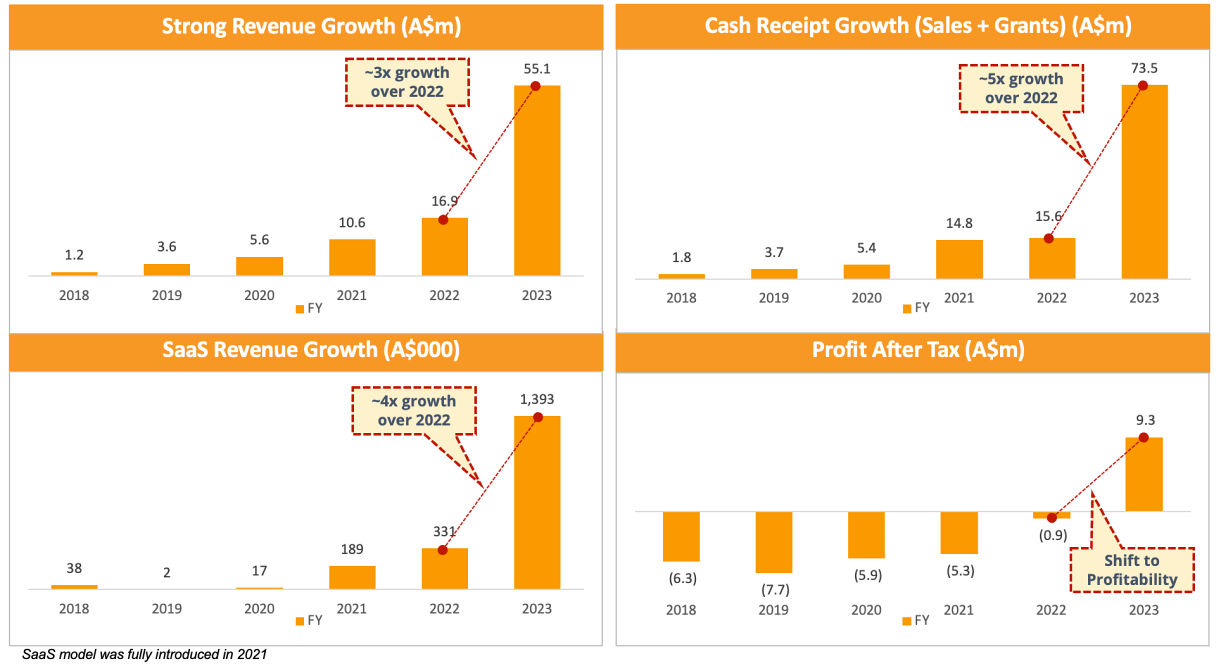 FY 23 showed record contracts and rapidly growing cash receipts, with $47.8 (AUD 73.5) million cash receipts, up 5 x vs. FY 22 and $35.8 (AUD 55.1) million revenue, up 3 x vs. FY 22. The revenue vs. cash receipt difference mostly due to advanced payments on product subscriptions (SaaS), warranties, as well as grants received.