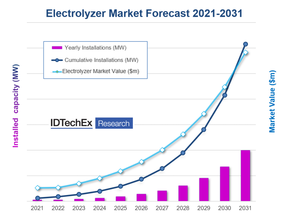 Therefore, IDTechEx investigated this fast-growing market, showing the outcome of their research in the new report “Green Hydrogen Production: Electrolyzer Markets 2021-2031”.