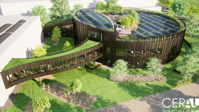 In addition to the energy-efficient performance of the outer walls, the roofs will be greened and will accommodate more than 600 photovoltaic panels. The landscaped surroundings, in addition to the greenery that they constitute, will host a rainwater management system which will include, in addition to a cistern, an open storm basin and infiltration ditches. Biodiversity will be encouraged by the planting of native and pollinating plants which will complement the hives already present on the site.