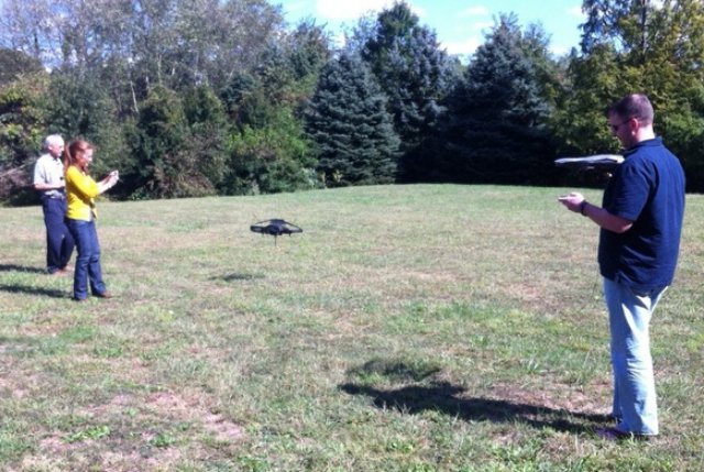 Photo: Alice Beauheim, her father and Bill Love fly their homemade machines at the Drone Smackdown in Manassas, Va.. Credit: John Proctor