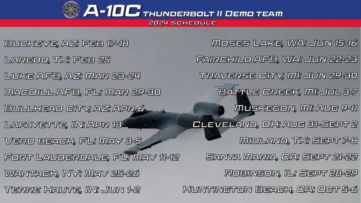 The A-10 Demo Team still has 18 shows scheduled across the country from March 23 to Oct. 5. The current pilot, Maj. Lindsay “Mad” Johnson, took command of the team in 2022 after serving around the world and deploying to Afghanistan.