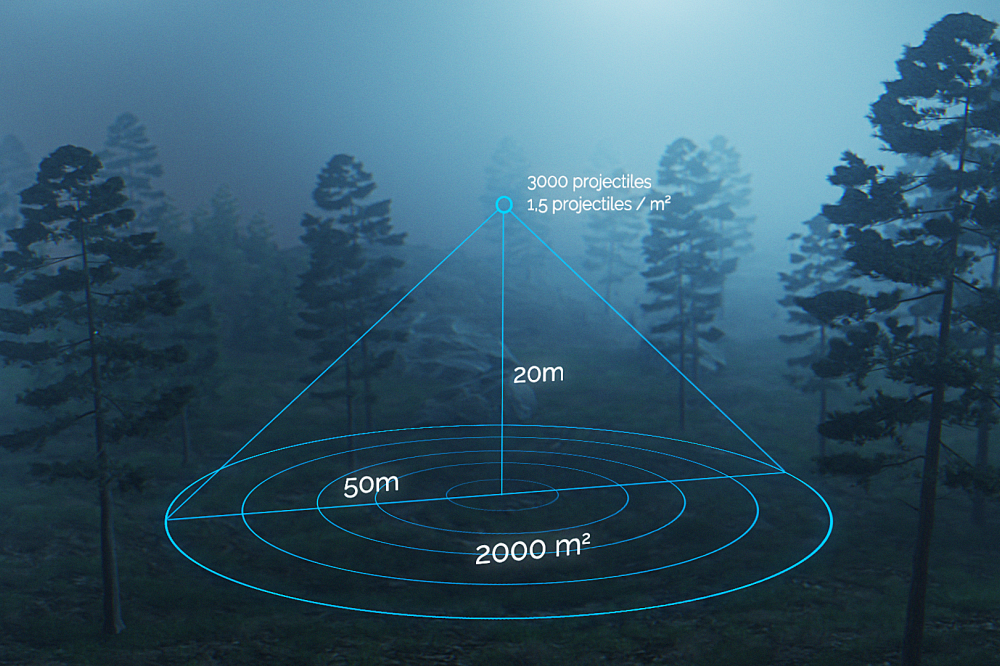 - Coming from above, the explosive effect can be freely adjusted according to the altitude of the drone; it has an opening angle of 90 degrees