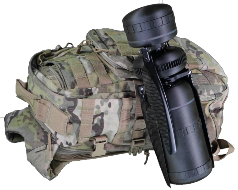 “The core is not much bigger than a coffee can and weighs just 3 pounds, but it can carry more than 10 pounds. With two batteries it can fit in a backpack and fly for more than 50 minutes. That’s unprecedented,” said CEO Peter Fuchs. “We’ve included quick-connect attachments on the top and the bottom of the drone, so you can configure it as needed to suit any mission.”