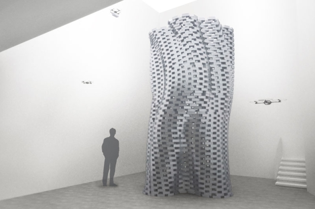 The Chair of Architecture and Digital Fabrication at the FRAC Cultural Centre in Orléans, France has commissioned a 3 month exhibition entitled "Flight Assembled Architecture". It runs from 01.12.2011-26.02.2012 and claims to be the first architectural installation to be built dynamically by flying machines and demonstrates a revolutionary assembly apparatus, addressing radical new ways of thinking and materializing architecture based on cutting-edge innovation and rigorous spatial and structural articulations.