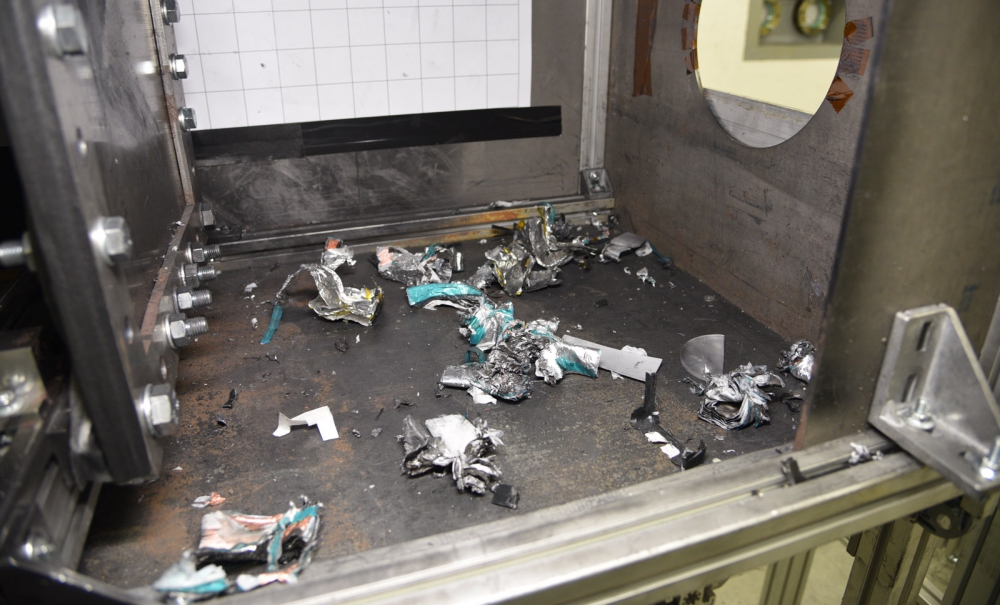“Using compressed air, we accelerated these two components to speeds ranging from 115 to 255 meters per second and fired them at aluminium plates up to eight millimeters in thickness that were mounted in a test bench,” Schopferer explains. Given their weight, both the battery and the motor can cause major damage: “There was substantial deformation and indentation of the plates, and the drone battery and engine were completely destroyed.” The outcome of the tests was recorded with a high-speed video camera.