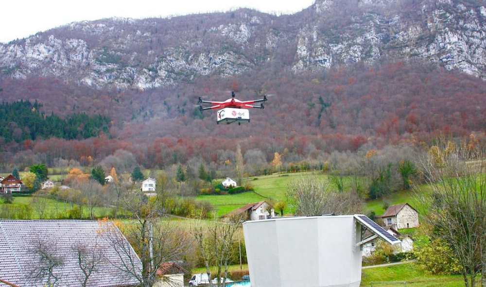 This is concretely to connect the small town of Fontanil-Cornillon, located north of the agglomeration of Grenoble, the village of Mont-Saint-Martin (760 m), on the foothills of the Chartreuse. It is DPD, a subsidiary of the Post Office, which manages the flights of this "flying factor" quite particular
