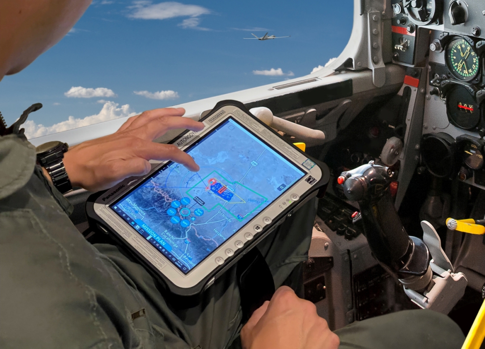 The flight demonstrated autonomous collaboration using command and control (C2) of the Avenger from a ruggedized tactical control tablet, integrated with Autonodyne’s RCU-1000 Advanced Human Machine Interface, to provide real-time situational awareness combined with complex behavior tasking. The airborne node utilized a GA-ASI-modified King Air 200, which allowed for rapid integration and test of the C2 hardware.