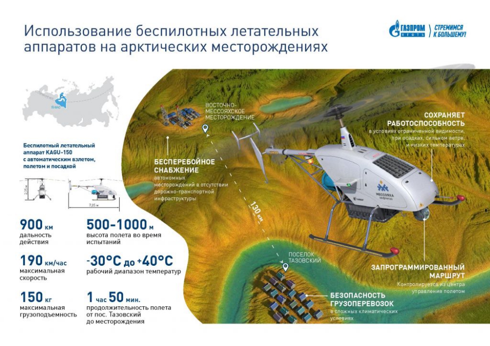For the first time in Russia, an unmanned aerial system was tested at the Vostochno-Messoyakhskoye oil and gas condensate field (Gydan Peninsula, Yamalo-Nenets Autonomous Okrug) designed to deliver heavy and oversized cargo in the Arctic. The unmanned helicopter "Tiber" KAGU-150 has successfully completed several flights and delivered material and technical resources to the oil field. The purpose of the tests is to confirm the potential of unmanned technologies for the operational and safe life support of the northern autonomous fields. The project was implemented by Gazpromneft-Snabzhenie specialists, representatives of the domestic manufacturer of unmanned systems Tiber, and Messoyakhaneftegaz employees.The air robot controlled from the company's logistics base in the village. Tazovsky, successfully overcame a 130-kilometer route and delivered a 150-kilogram cargo to the field. The device has demonstrated high technical capabilities in the Arctic. The second stage of testing at Vostochnaya Messoyakha is scheduled for December 2020: the developers of the air complex and oil workers intend to test the drone in the Arctic winter.https://youtu.be/P3utU5j4KAIThe introduction of unmanned technologies into logistics processes at the northern fields is a key task for Gazprom Neft. Every year, the company delivers hundreds of thousands of tons of engineering and drilling equipment, construction materials, and resources for the life support of oil production centers to autonomous oil fields by land and air transport. The use of unmanned aircraft opens up great opportunities for oil workers for the prompt and safe delivery of the necessary resources to the field. The Tiber helicopter testing was the third test of unmanned technologies in logistics that Gazprom Neft conducted in 2020 at its upstream assets. Earlier, the company tested in the territory of Yamal and Yugra a cargo ground transport capable of working in an autonomous mode. Based on the results of the tests carried out, Gazprom Neft will accelerate the process of introducing unmanned solutions into its logistics processes and will continue to actively participate in the formation of the legal framework governing the use of unmanned vehicles in Russian oil fields.