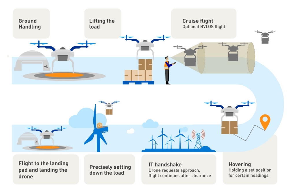 On 19 and 20 June, DLR and the energy supplier EnBW are organising the Offshore Drone Challenge at the National Experimental Test Center for Unmanned Aircraft Systems in Cochstedt. The focus of this competition is the demonstration of a freight transport mission that is relevant in the operation and maintenance logistics for offshore wind farms. During the two-day event, seven drone manufacturers and service providers will be demonstrating their technologies and undergoing various tasks such as picking up and setting down a load with as little manual intervention as possible, or flying out of visual line of sight. The flight demonstrations will be a first step in demonstrating drones' capabilities in offshore goods transportation.