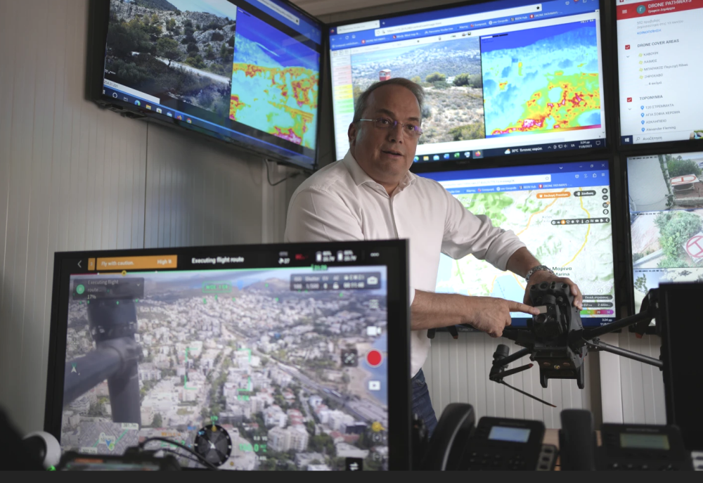 The system’s innovation, said Emmanouil Angelakis, managing director of the company operating the drones, is that it includes specialized personnel, software, servers and satellite antenna so “drones, day and night, can scan all the forest areas with thermal cameras and sensors and give live images and coordinates of where a fire starts.”