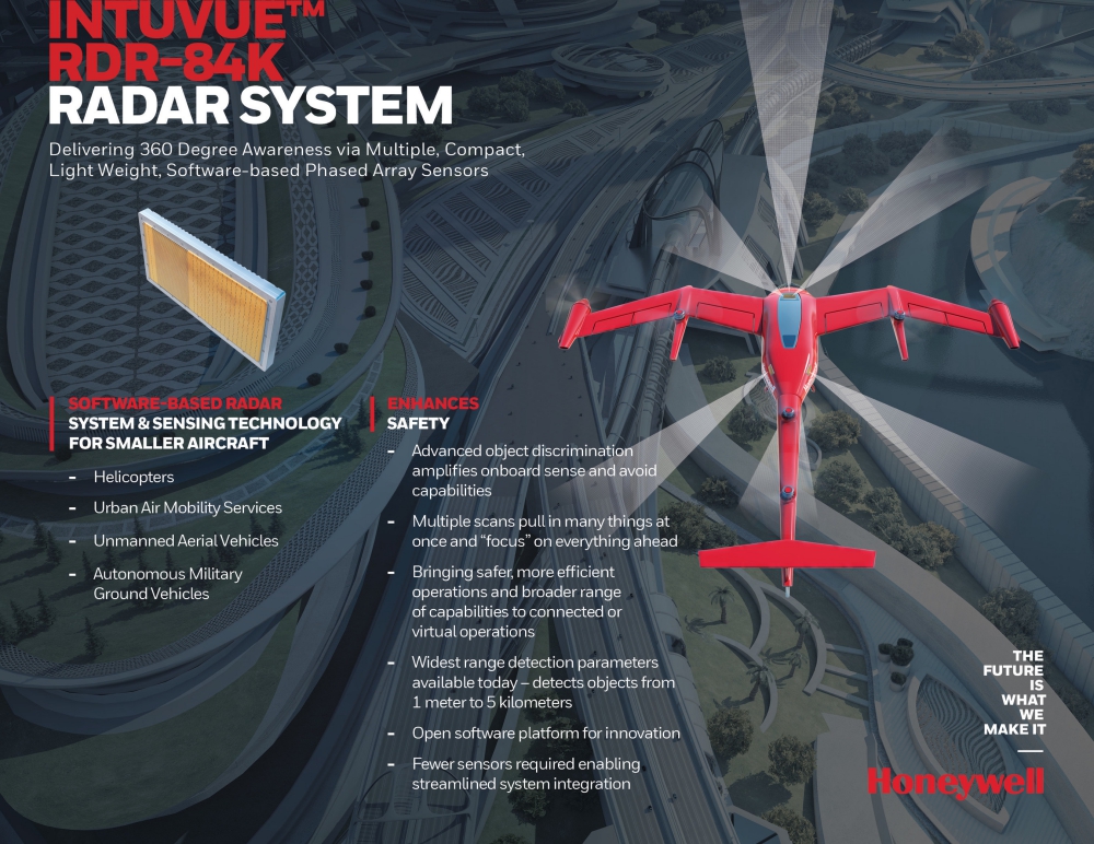 Honeywell has signed an agreement with an unnamed air taxi developer to supply multiple units of its new IntuVueTM RDR-84K Band Radar System for the developer's urban air mobility (UAM) prototype aircraft. The innovative, compact and lightweight software-based radar detects multiple obstacles in and around its flight path and is a major step toward automating the takeoff and landing of UAM aircraft.