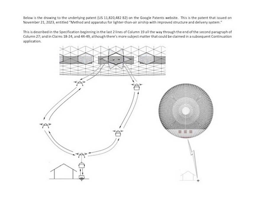 US Patent 11,820,482 B2, entitled “Method and Apparatus for Lighter-Than-Air Airship with Improved Structure and Delivery System,” was issued by the United States Patent and Trademark Office (USPTO) and focuses on enhancements over previous airship designs and operating modes. Methods such as those described in H2C’s latest patent are focused on improving the “last mile” of delivery.