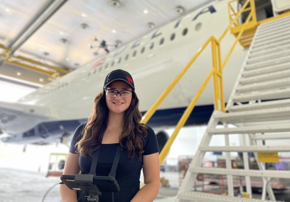 Overseeing the drone is Emma Galarza, a senior engineer with Delta TechOps, the division of Delta responsible for aircraft repair and maintenance. Galarza, one of a handful of drone pilots at Delta TechOps, is a member of the Technology Development team working on autonomous drone technology to help make aircraft maintenance more efficient and safer for our people without compromising the quality of the result.