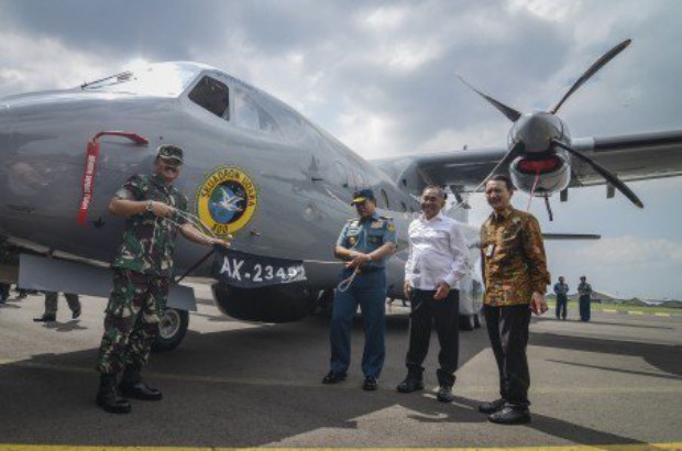 Photo: Defense Minister Ryamizard Ryacudu (second right) talks to Indonesian Military commander Air Chief Marshal Hadi Tjahjanto (left), Navy chief of staff Admiral Ade Supandi (third right) and PTDI president director Elfien Goentoro after a handover ceremony of five helicopters and one CN235 aircraft from PTDI to the Defense Ministry in Bandung on Jan. 9. (Antara/Raisan Al Farisi)