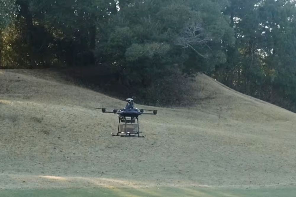 When the drone is flying, golf carts at the course emit warnings to notify other golfers about the aircraft. In the test, a drone flew to a destination roughly 400 meters away in about three and a half minutes.