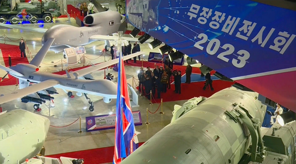 Both appear in photos of the “Weapons and Equipment Exhibition 2023” held in Pyongyang on Wednesday, and both appear to be models that NK Pro first identified on runways at an airbase in the northwest of the country last month, a sign of flight testing.