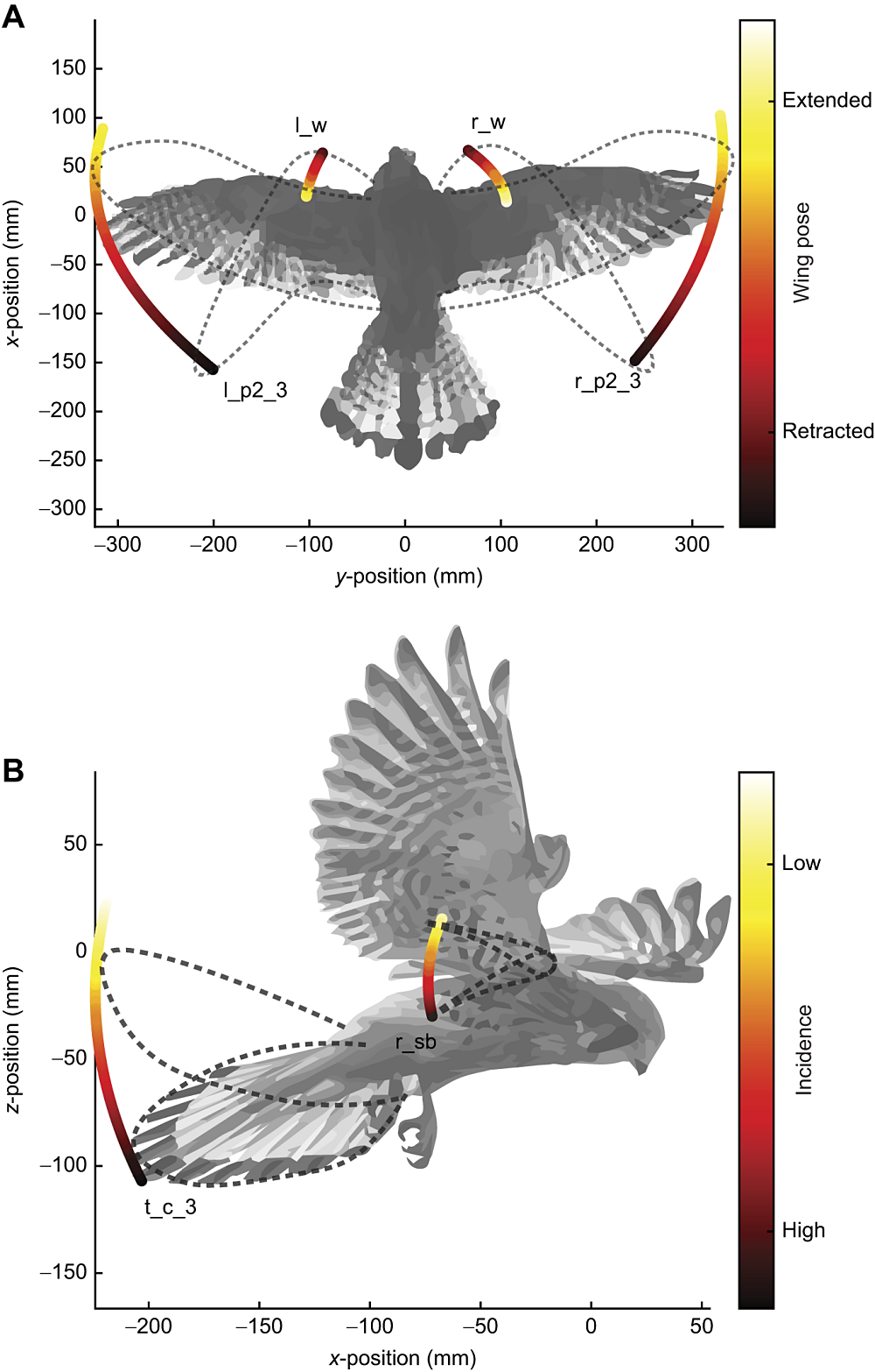 The motion of the birds' head and body, and the morphing motions of their wings and tail were tracked and analysed using correlation methods. The results revealed that wing sweep, representing the flexion/extension movement of the wing, played a significant role in wing motion.