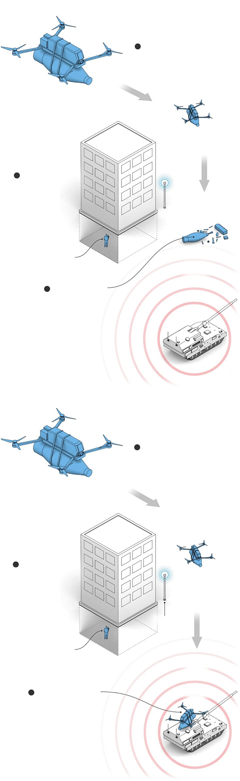 Autopilot offers a string of advantages. In standard FPVs, the link between the controller and the drone relies on radio waves, so the drone needs to avoid large objects that can block the signal. Ukrainian drone teams often send up a second craft to hover in the air and relay the signal between pilot and FPV, allowing them to operate from a bunker and extend the range of the craft up to 15 miles. But the Russians hide tanks and other potential targets on the far side of hills or behind obstacles that cut the link as the drone approaches.