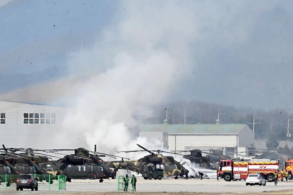A South Korean army helicopter was destroyed when an unmanned air vehicle crashed into it while attempting to land. The accident occurred on 17 March at an army base in Yangju, when the Israel Aerospace Industries Heron UAV crashed into a Korea Aerospace Industries KUH-1 Surion utility helicopter.