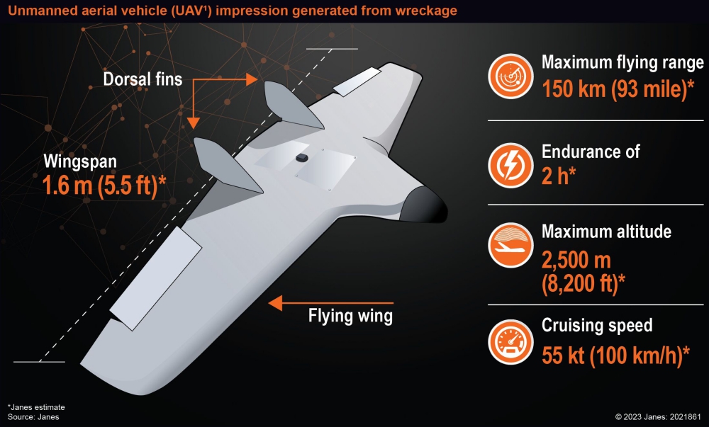 According to the imagery, the UAV wreckage suggests that the aircraft belongs to the mini category (Janes classification of UAVs weighing between 2 and 20 kg). The UAV features a flying wing configuration, attached with dorsal fins on either side of the fuselage centre module rather than a conventional empennage. Imagery also indicates that the UAVs are mostly propelled by an electric or a rotary engine.