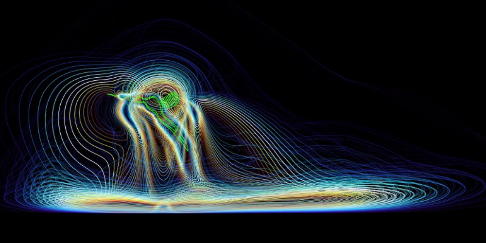Aerodynamic simulation of a hovering mosquito showing its wake touching the ground. Highly sensitive organs at the base of the antennae monitor the flow and can detect this event even at some distance from the surface. (Credit: Chiba University; Structure and Motion Laboratory, RVC)