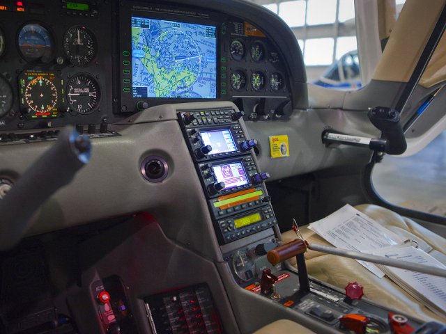 Photo: The Cirrus SR-22 is modified to act as an unmanned aircraft. During flight tests software onboard and an experimental auto throttle (bottom right) have allowed the plane to automatically sense and avoid other air traffic. Credit: NASA/Sean Smith