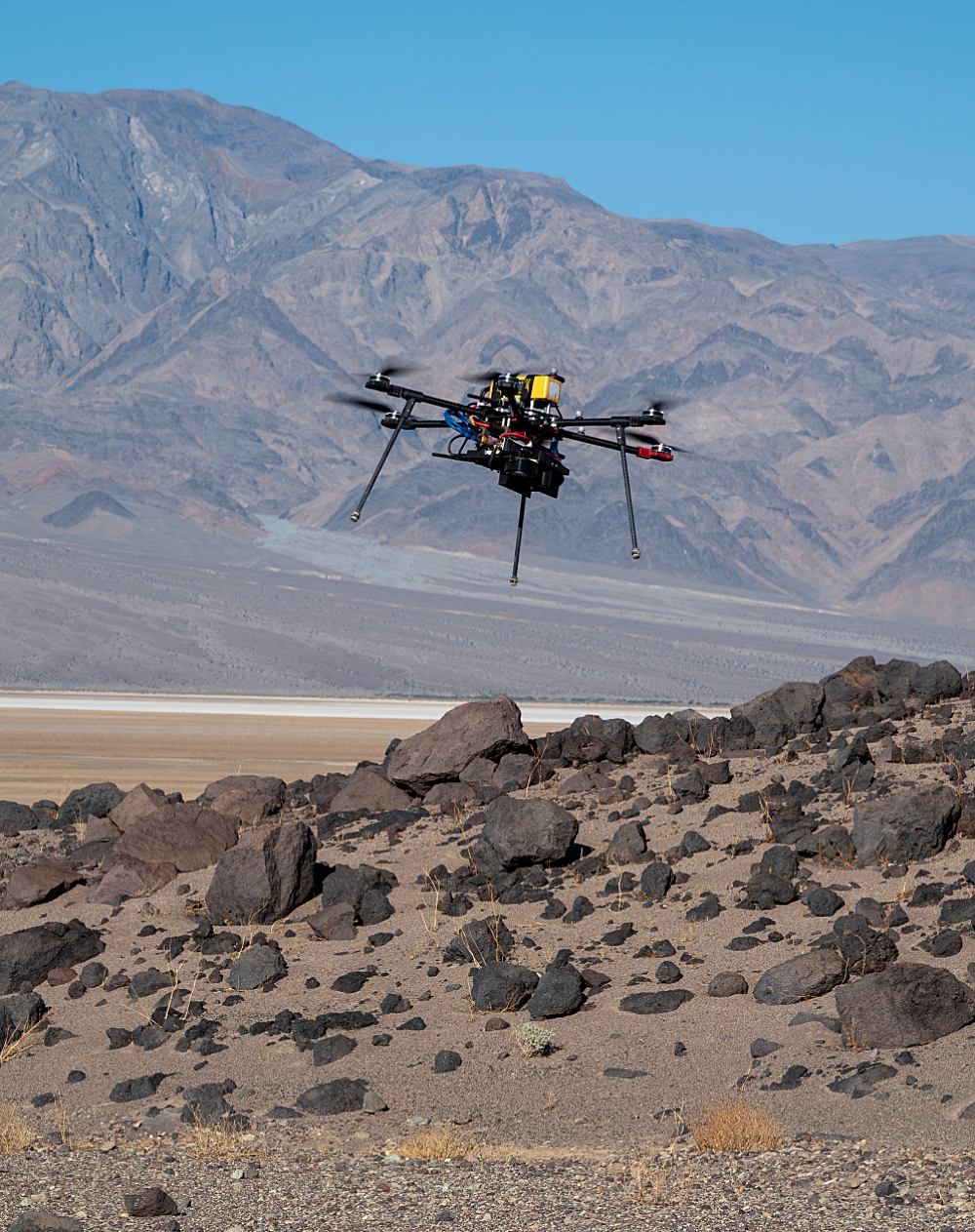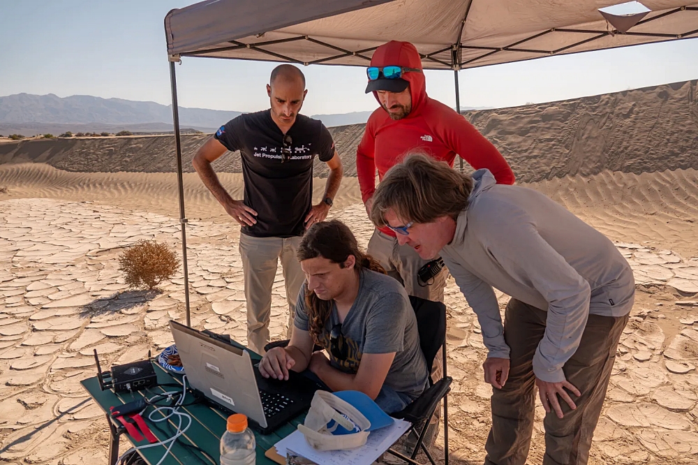 For the drone testing, engineers traveled to the park’s Mars Hill and Mesquite Flats Sand Dunes in late April and early September. The JPL team received only the third-ever license to fly research drones in Death Valley. Temperatures reached as high as 113 degrees Fahrenheit (45 degrees Celsius); gathered beneath a pop-up canopy, team members tracked the progress of their drones on a laptop.