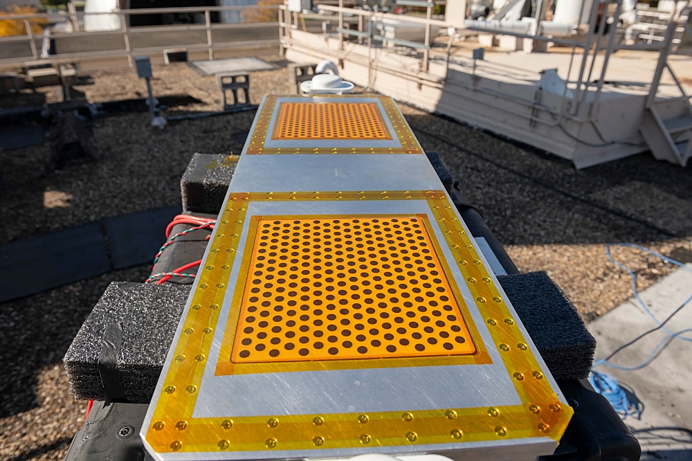 Top Photo: NASA Glenn Research Center’s Sarah Dever and Mick Koch, electrical engineers, command an active phased array antenna to point toward a geostationary satellite. They used a flat version of an aerogel antenna during tests in October 2024. Credit: NASA/Sara Lowthian-Hanna