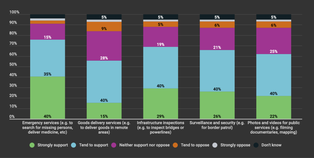 According to NATS’ annual survey – called the Aviation Index - three quarters of the UK public support drones being used by the emergency services, 70% support their use for infrastructure projects, such as inspecting powerlines, and 55% support the idea of them being used for routine deliveries.