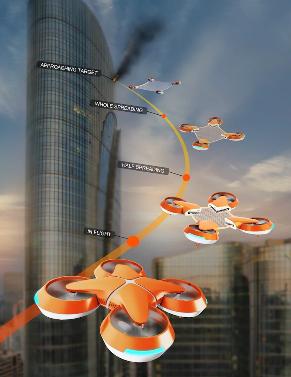 NET GUARD is a high altitude self-driven UAV drone concept designed by a group of 6 students in Guangzhou, China. the creation is meant to rescue people from high-rise fire emergencies — when receives a distress signal, it uses GPS to pinpoint the location of the fire. Travelling at high altitude to avoid traffic and reach the scene of the emergency in the fastest possible time, the drone approaches the scene and unfolds into four parts with a safety net at the center.