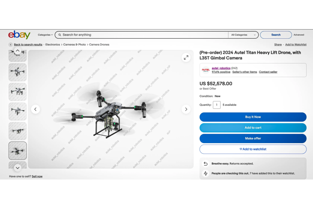 Iturbe also identified a separate listing from an Autel storefront on eBay using the very same three images of an armed Titan drone. When asked about the images and whether the drone is compatible with other weapons systems, the account replied via eBay message: “The bombs shown in the listing for this drone is just for display. Pls note that Titan comes with a standard load of 4 kilograms and a maximum load up to 10 kilograms.”