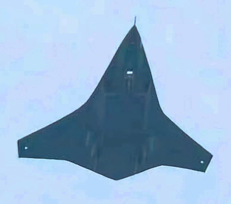 The aircraft seen in the recently emerged images has a notably pointed forward fuselage and nose section that blends into the mid-set wing midway down the fuselage. The highly swept wing has cropped tips, and the trailing edge features a prominent triangular extension, with a ‘W’-like configuration. There are no vertical stabilizers or other separate tail surfaces. The broad fuselage would appear to offer a fairly significant capacity for internal fuel and stores, although details of a weapons bay are not apparent in the available views.