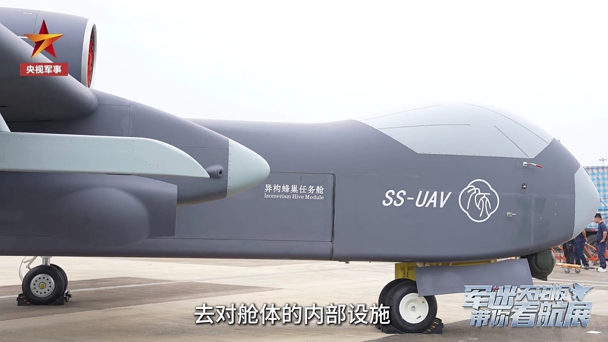 Reportedly dubbed Jiu Tian, or “High Sky” in Chinese, the new jet drone design comes from the state-run Aviation Industry Corporation of China (AVIC). The example at Zhuhai, which officially opens next week, is also marked “SS-UAV” in Latin script. While “UAV” (uncrewed aerial vehicle) seems obvious, it is unclear what the “SS” might stand for.